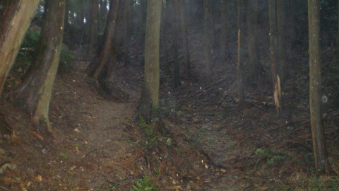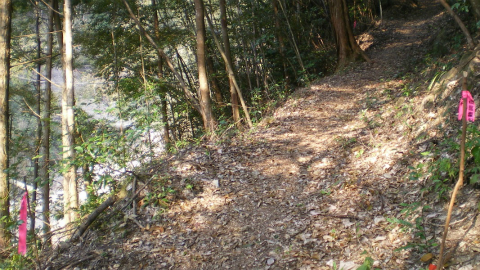 いよいよ急勾配の峠道に向かう。最近まで整備が行われていたため、ピンクテープも真新しい。
