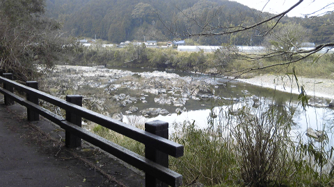 資材置き場のような広場で右に折れると、下り坂となる。どうやら低い山をひとつ越えたようだ。遍路地図だとよく分からないような山だが、七子峠からここまで平坦な道が続いてきたのでちょっときつかった。ここからは四万十川に沿って五社まで下り坂となる。ちなみに、遍路地図等では四万十川と書いてあるが、橋の表示をみると地元では渡川というらしい。