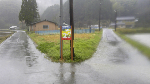 しばらく平和な田舎道が続く。ところが5分ほど歩くと道は登り坂となり、林の中に入って行く。左側は川に向かって斜面となっており「ゴミ捨て禁止」の立札が何回か現れる。こうした立札は人通りのない道によく立てられているので、ちょっと心配だ。そういえば道の駅からこちら、誰ともすれ違わない。