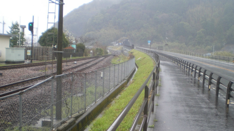 峠まで登山道そのものの険しい道が数十分続いたのに、峠から先は水田の続く平坦な道というのは、すごく違和感がある。JRの線路もこの間トンネル続きで標高を上げるのだが、歩くと余計に不思議に感じる。峠からは国道と合流し、休憩所・展望台がある。展望台からは、いま登ってきた谷間の道を久礼の街まで見下ろすことができる。