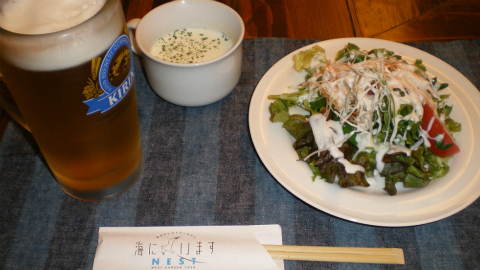 お風呂をいただいてから、荷物の整理をする。ここまでの宿がゲストハウス恵、岩本寺宿坊と和室続きだったので、椅子やベッドに腰かけることができるのはたいへんに気持ちがいい。せっかくなので、机に資料を広げて真念庵の感想をメモする。そうこうしている間に夕飯の時間となった。