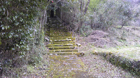 まず、じんべえ広場のある以布利漁港から堤防沿いに、海からゴミが流されている海岸を進む。あまり歩きたい道ではないが、「遍路道→」の表示があるのでここを通るしかない。海沿いにしばらく行った後に、急傾斜の山道になる。もちろん、歩きでしか通れない道である。道幅も狭く、じめじめしている。滑りそうだし、まむしとかがいてもおかしくない道である。