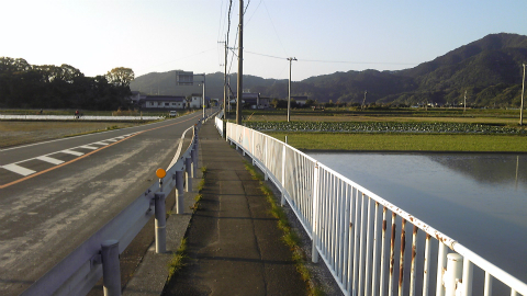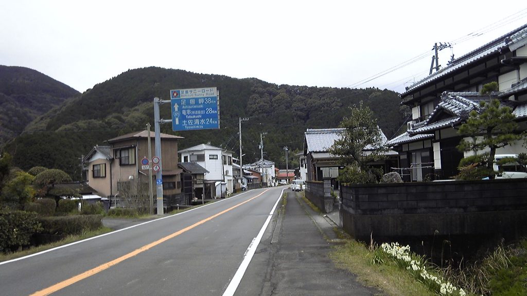 平坦な道はゆるやかなカーブを描きながら続く。山並みは意外と近くまできているが、川に沿っているので大きな起伏はない。大きな荷物を持つ身には、ありがたいことである。国道の表示板に「気温16℃」と出ている。前回(2016年秋の牟岐~須崎)とは打って変わって涼しい気候で、これもありがたい。