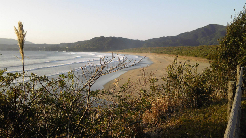「海癒の湯」のあたりから、左手下方向に大岐海岸が見えてくる。後方には小高い丘と山の緑、手前には横に広がる海岸、そして海。砂浜には見る限り商業施設のようなものは何もない。季節が秋だからか朝早くだからか、誰もいない砂浜はたいへんに静かであった。この海岸を歩く遍路道もあるらしいが、案内も見つからないのでおとなしくずっと国道を歩く。