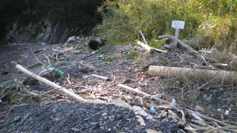 その後は、いろいろなものが流れ着いている海岸を通り、さらに急傾斜の森の中を登らなければならない。