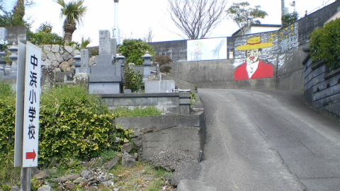 少し安心して、へんろ道に入る。このあたりのへんろ道は民家の軒先を通る狭い道で、漁村らしく結構な登り下りがある。10分も歩くと中浜に着いた。墓地のある坂道を登ると中浜小学校で、壁にカウボーイハットのおじさんの絵が描いてある。小学校から下りてくる交差点には「知らない人にはついていかないように 中浜万次郎」の立札がある。