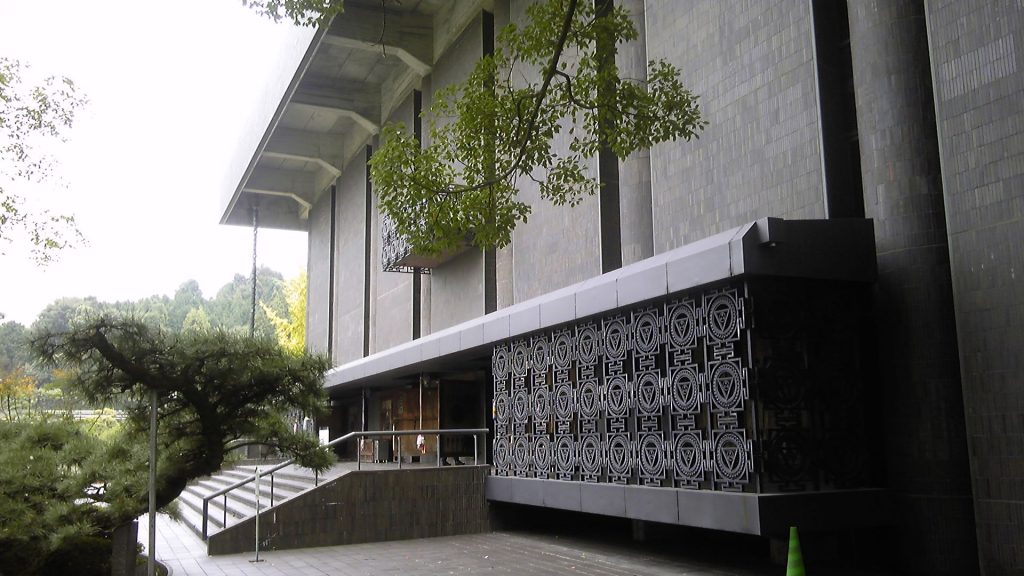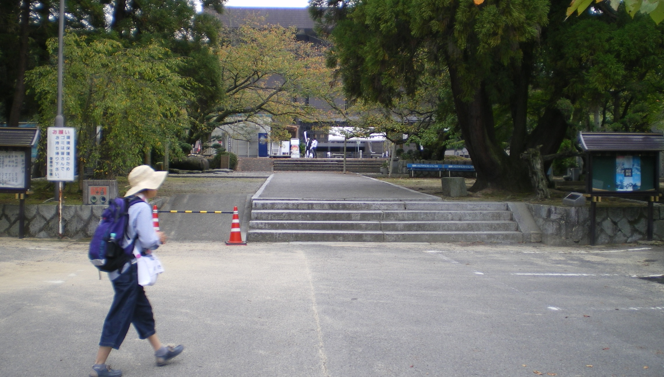木立ちの向こうから迫る巨大なホール(大聖堂)。納経所はこのホールの前、この写真では左側になる。