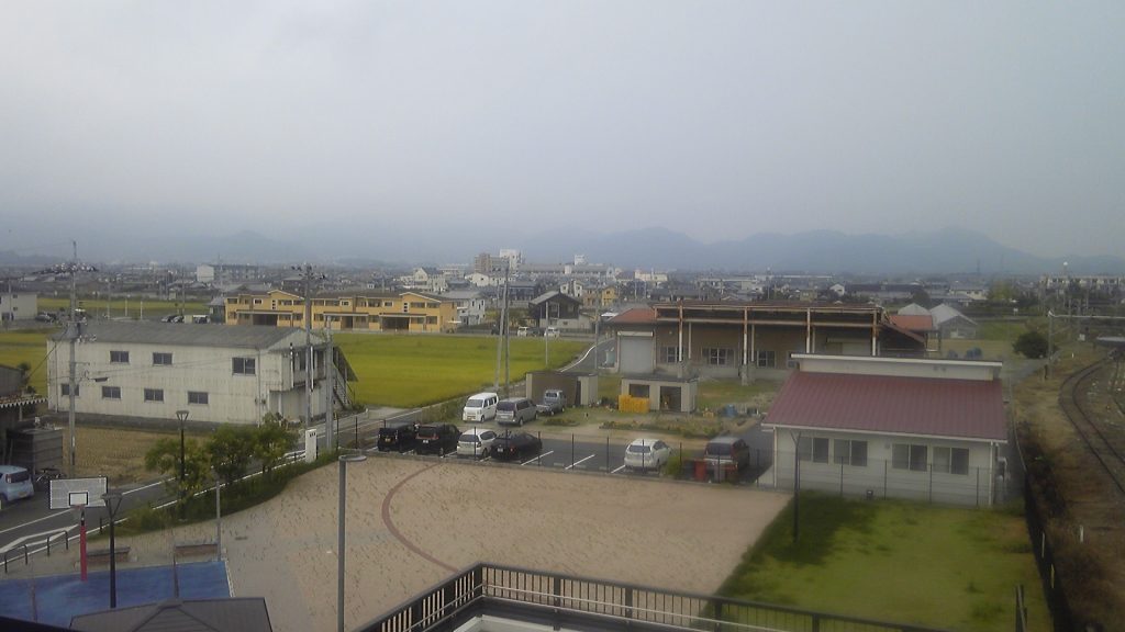 跨線橋の上から、これから向かう横峰方面を望む。この時点で雨は降っていなかったが、雲でほとんど山並みを見ることはできない。