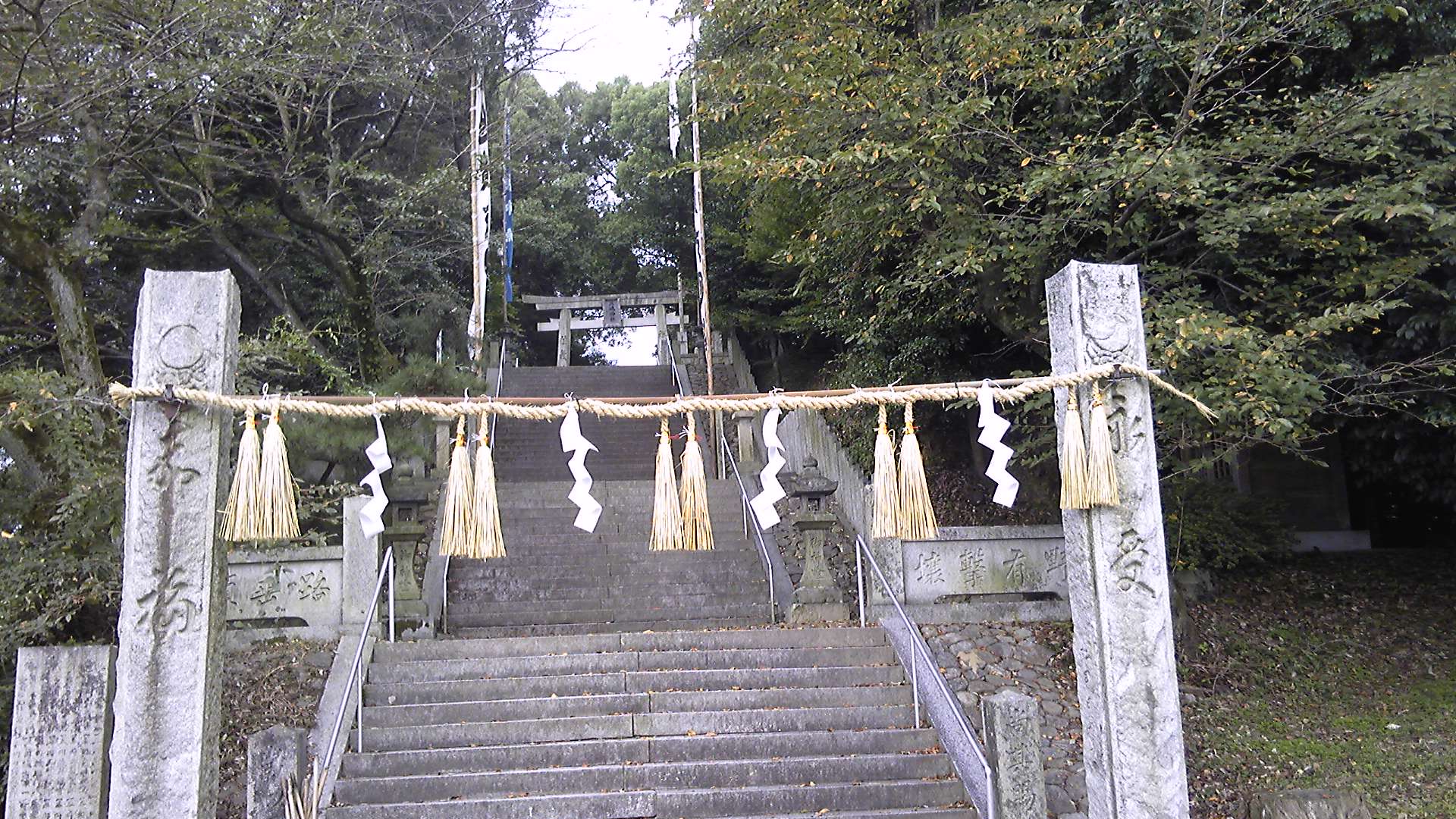 本殿へは、大鳥居を抜けて石段を登って行く。鳥居や石柱は比較的新しいが、ところどころに古い時代の石碑や灯籠がみられる。