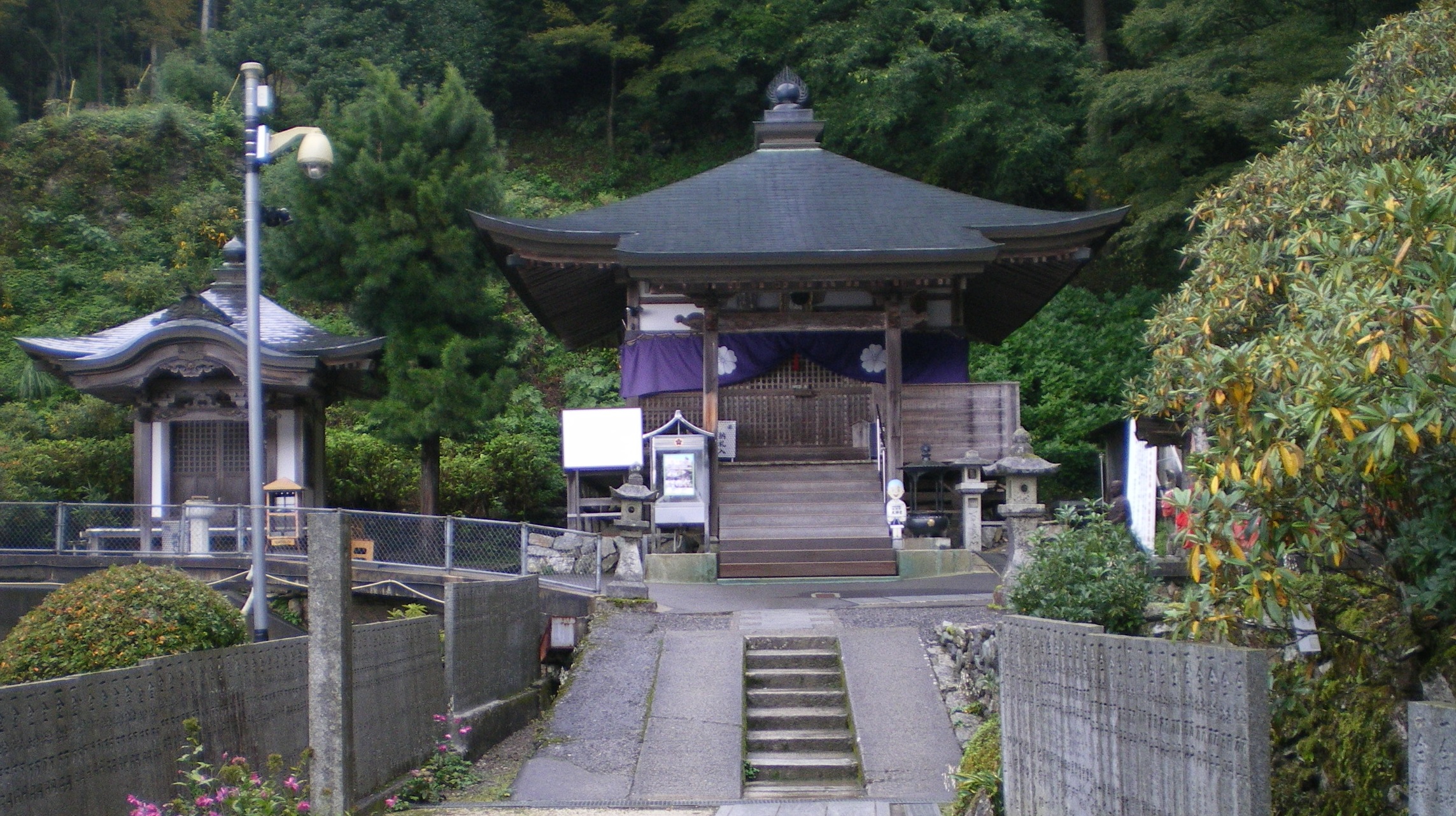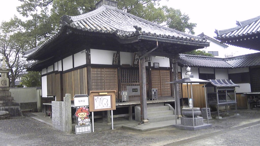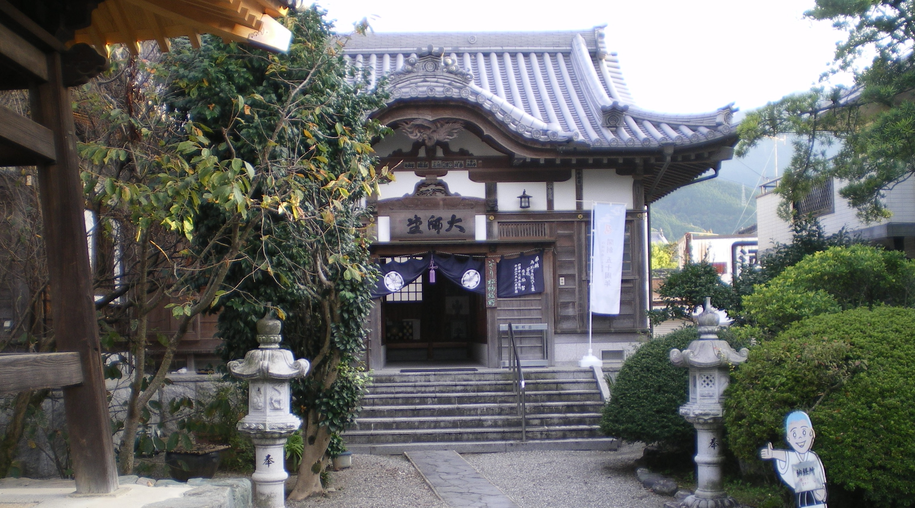 本堂よりやや小ぶりな大師堂。右に見える屋根は本堂で、回廊でつながっている。この左に通用門があり、背後は国道11号線。