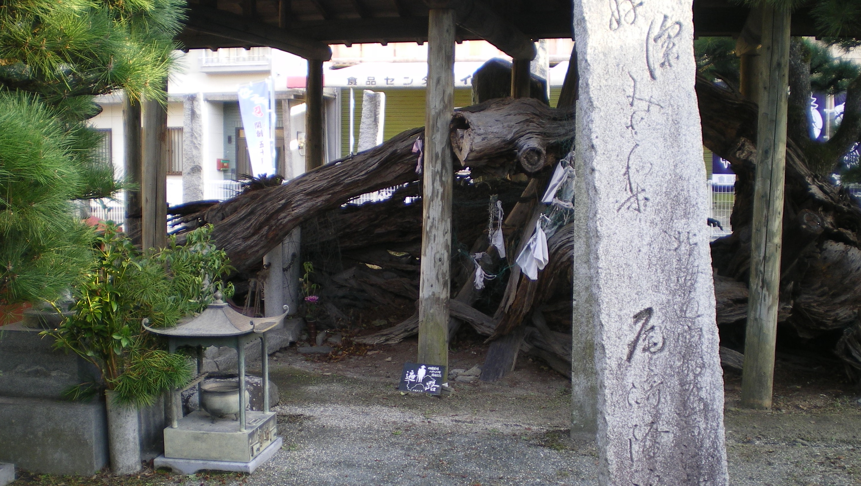 通りを隔てた公園の一角に、屋根をかけられた「いざり松」がある。お坊さんに教わったとおり、幹を撫で、その手で足をさする。枯れ木というとささくれ立って棘があったりするが、この松はみんながさするせいか、おびんずる様のようにすべすべしている。
