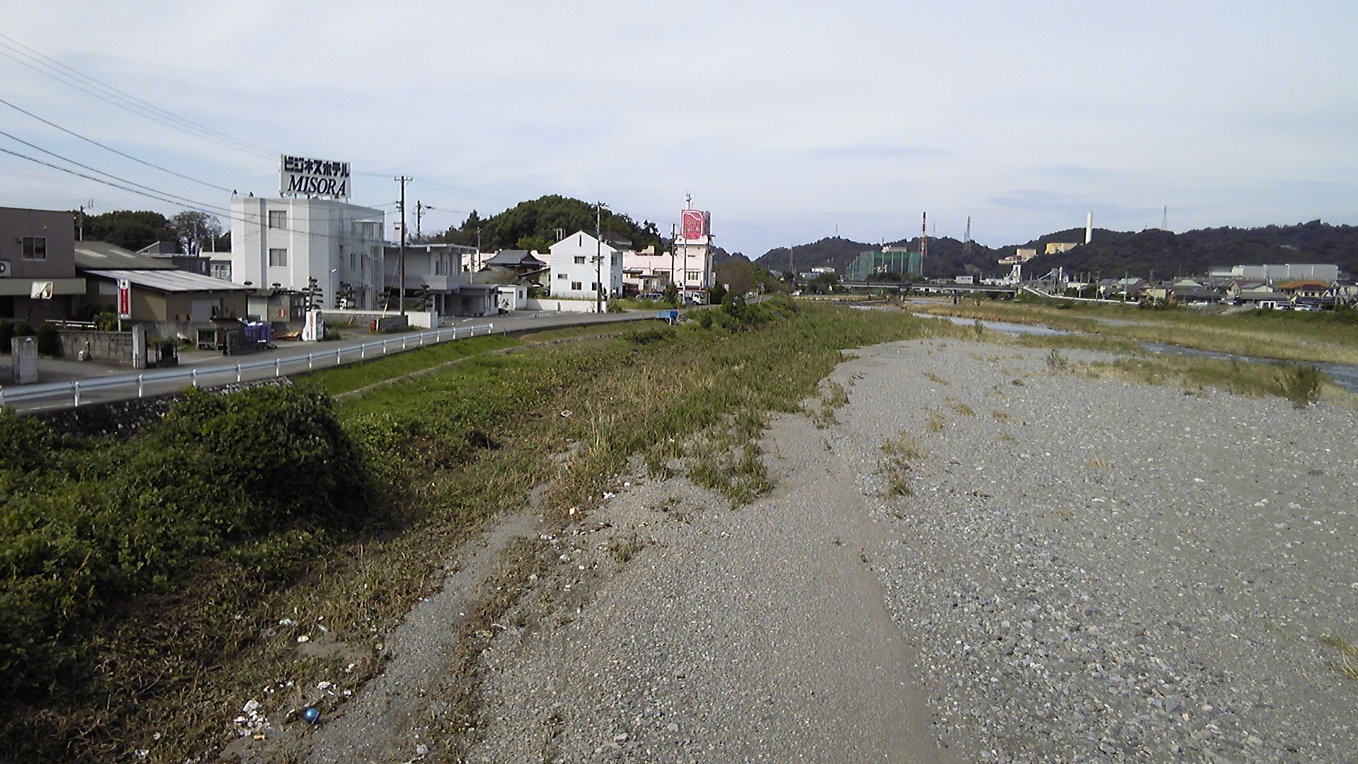 中山川を渡ったあたりから見た小松方向。左の高台に見える建物が小松高校で、その前あたりに三嶋神社がある。