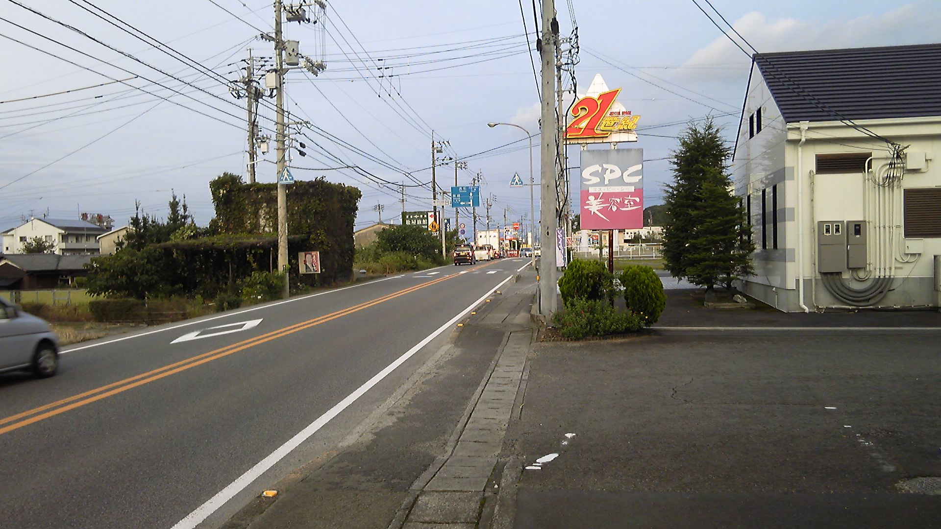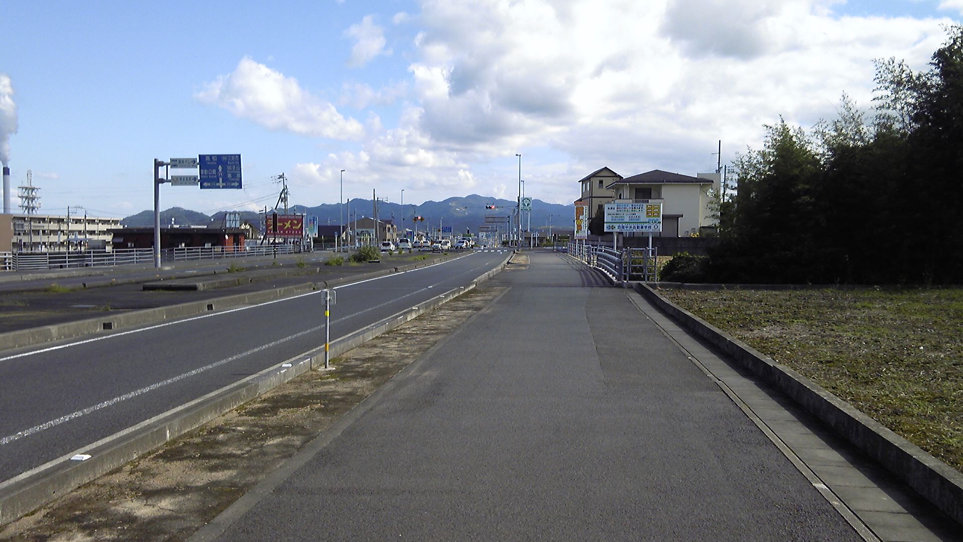 いよいよ市街地に入ってくると、ロードサイド店やいろいろなビルが国道の両側に並ぶようになり、やがて海側と山側の二つの道に分かれる。海側の道は市街に入るもともとの国道11号で、山側は市街を迂回するバイパスのようだ。そして、山側を進む方が、三角寺には近い。