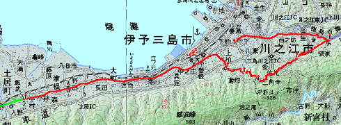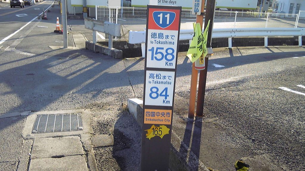 国道192号はマイナー国道だが、それでも国道なのでちゃんと㌔ポストがある。そして、途中に2度、高速道との交差があるので目安になる。下り坂でもあり、1日の終わりで疲れていたにもかかわらず、㌔13分のペースで4km歩き、川之江市街に入った。