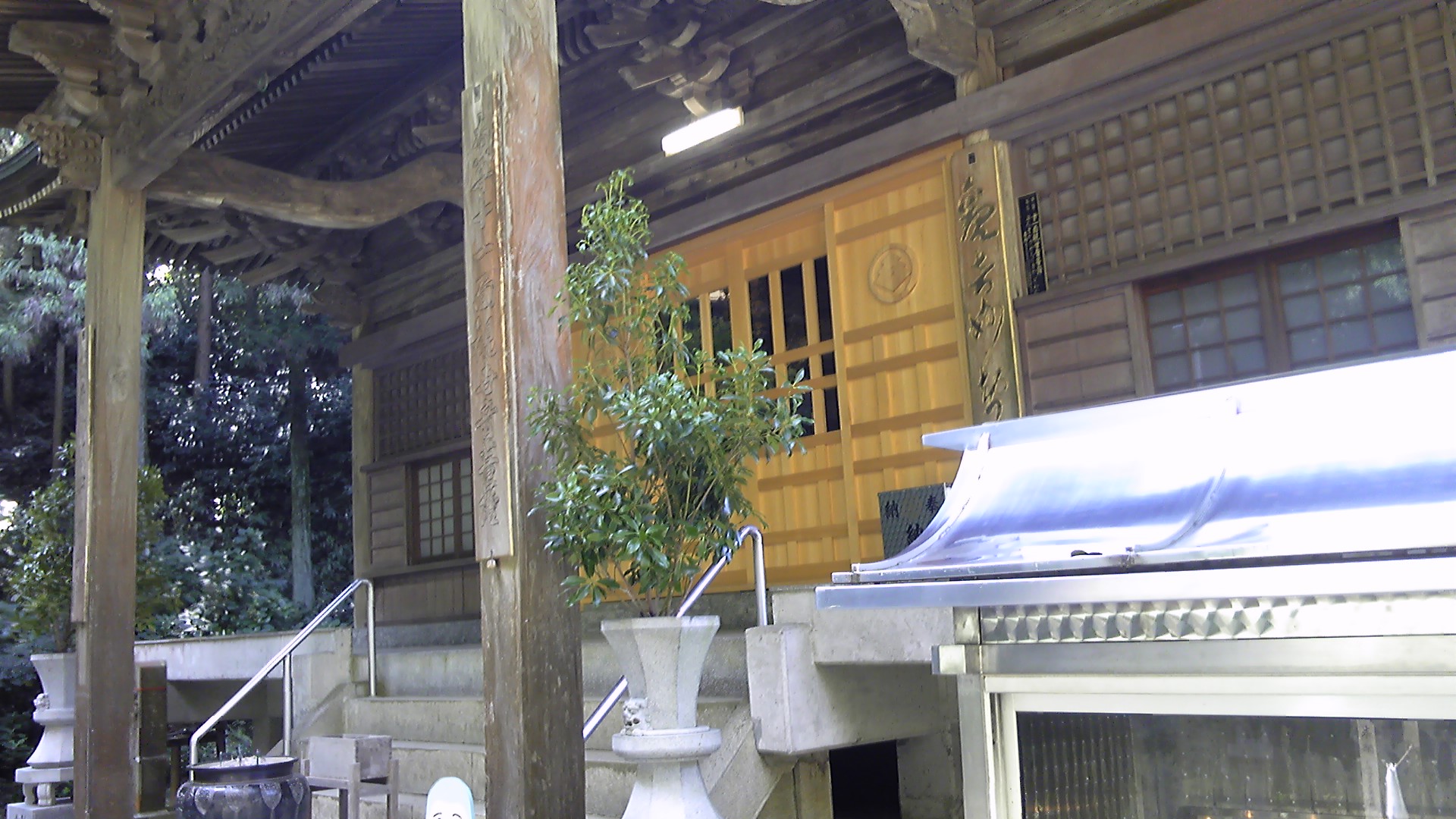 伊予の多くの寺と同様、戦国時代に一度焼亡し、再建されたのは江戸時代である。本堂の基礎部分はコンクリで補強されているが、これは昭和46年に行われたという修復によるものであろう。目立つのは内陣を仕切っている木の引き戸で、ここだけが真新しい黄色である。何か謂れがあるのかもしれない。ご本尊は大師御製と伝えられる十一面観音菩薩。