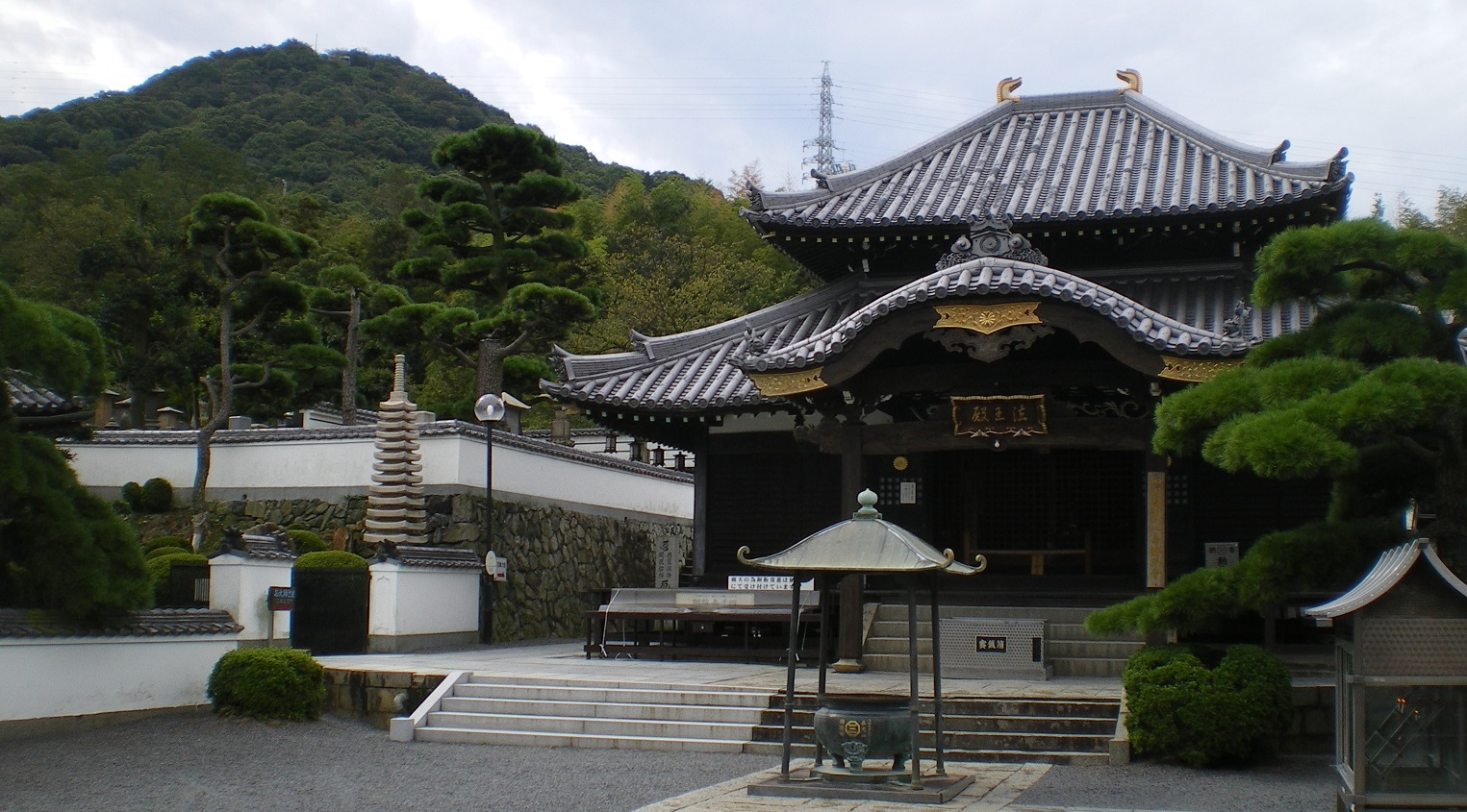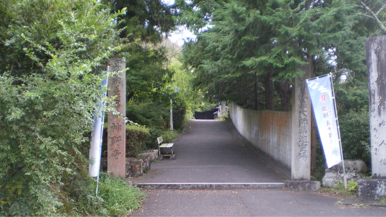 五穀山神野寺(ごこくさん・かんのじ)、空海が建設した満濃池の畔に建つ。五穀山の山号は、この池が灌漑用に作られ、農業生産に貢献したことにより名付けられたものと思われる。