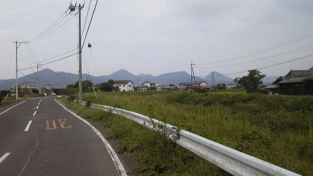 琴平の市街地から消防署の前を歩いていくと、あっという間に田園風景となった。川沿いに点々と農家らしき建物があり、背後には山並みが見える。あのあたりが満濃池だろうか。ずいぶん距離があるような気がする。