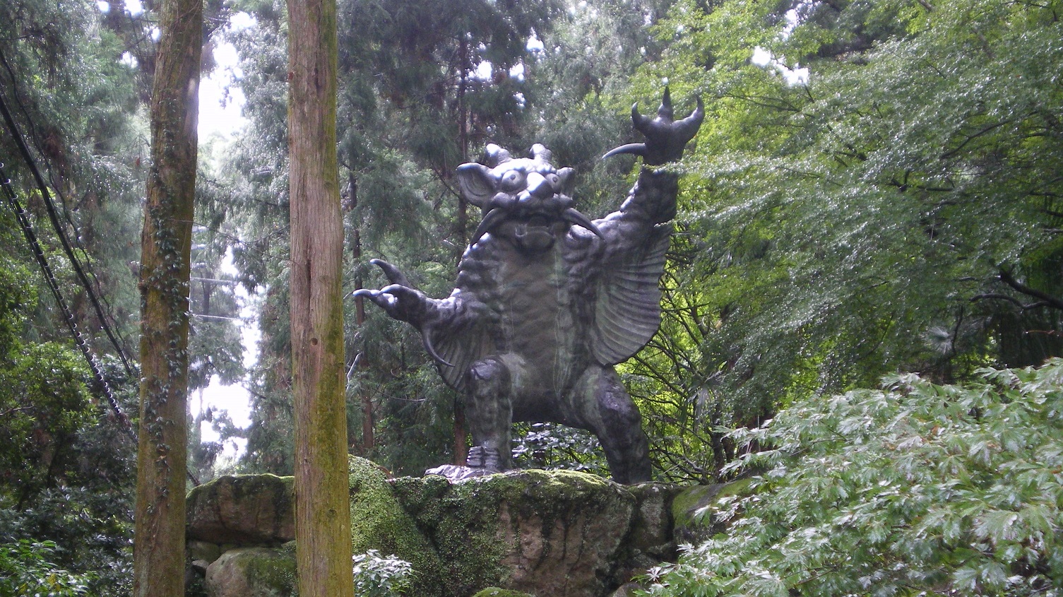 銅像は、この掛け軸の絵姿をもとに造られていて、両足を踏ん張って左手を高く上げて威嚇している。大雨の中で見たからというだけでなく、腕と腹の間に水掻きのようなものがあり、体もうろこで覆われているので、牛というよりも水生動物のように見えた。