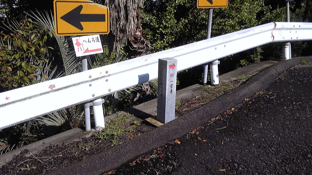 実際、ここからの下りは車道と遍路道が混在しており、遍路道の傾斜はきつく、たいへん歩きにくい道だった。それと、右折を指示する遍路シールと左折を指示する案内表示が混在し、どちらを通ったらいいのか迷うケースもあった。