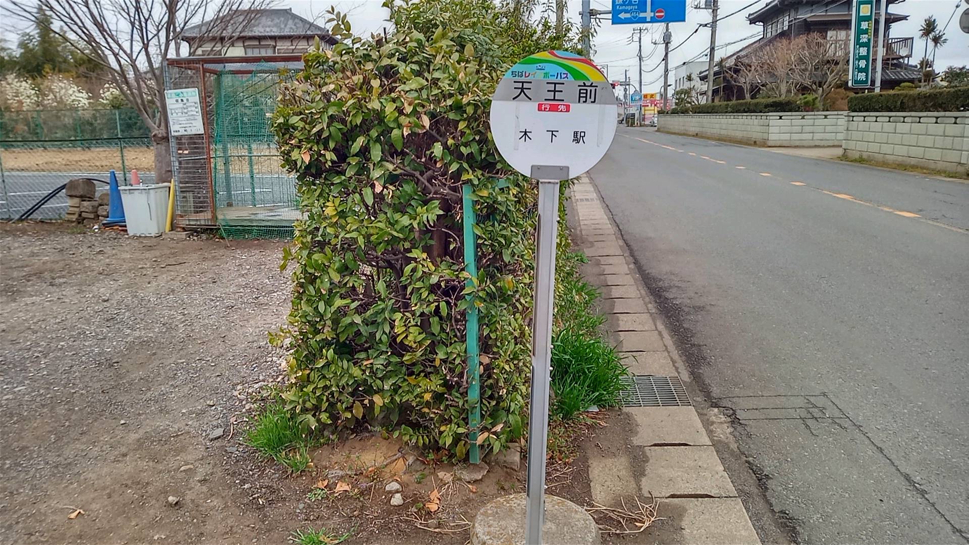 このあたりの小字名は「天王前」といって、バス停名にもなっている。つい先日までここに大きなパチンコ店が営業していたが、現在は取り壊されて更地になっている。津田沼方面から木下に抜ける道はニュータウン開発によって複数できたけれども、もともとここが唯一の道で、バス通りでもあった。