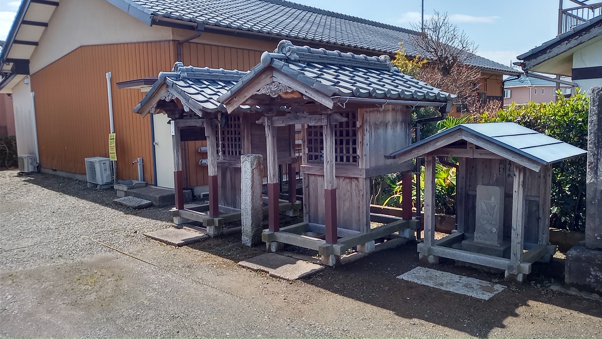 まず泉新田の番外札所を探す。通り沿いにそれらしきお堂が二つあって、一つは共同墓地と庚申塔の横、もう一つは八幡神社の隣にある。おそらく前者が真常寺、後者が不動堂であろう。両方とも、手を合わせてお参りする。