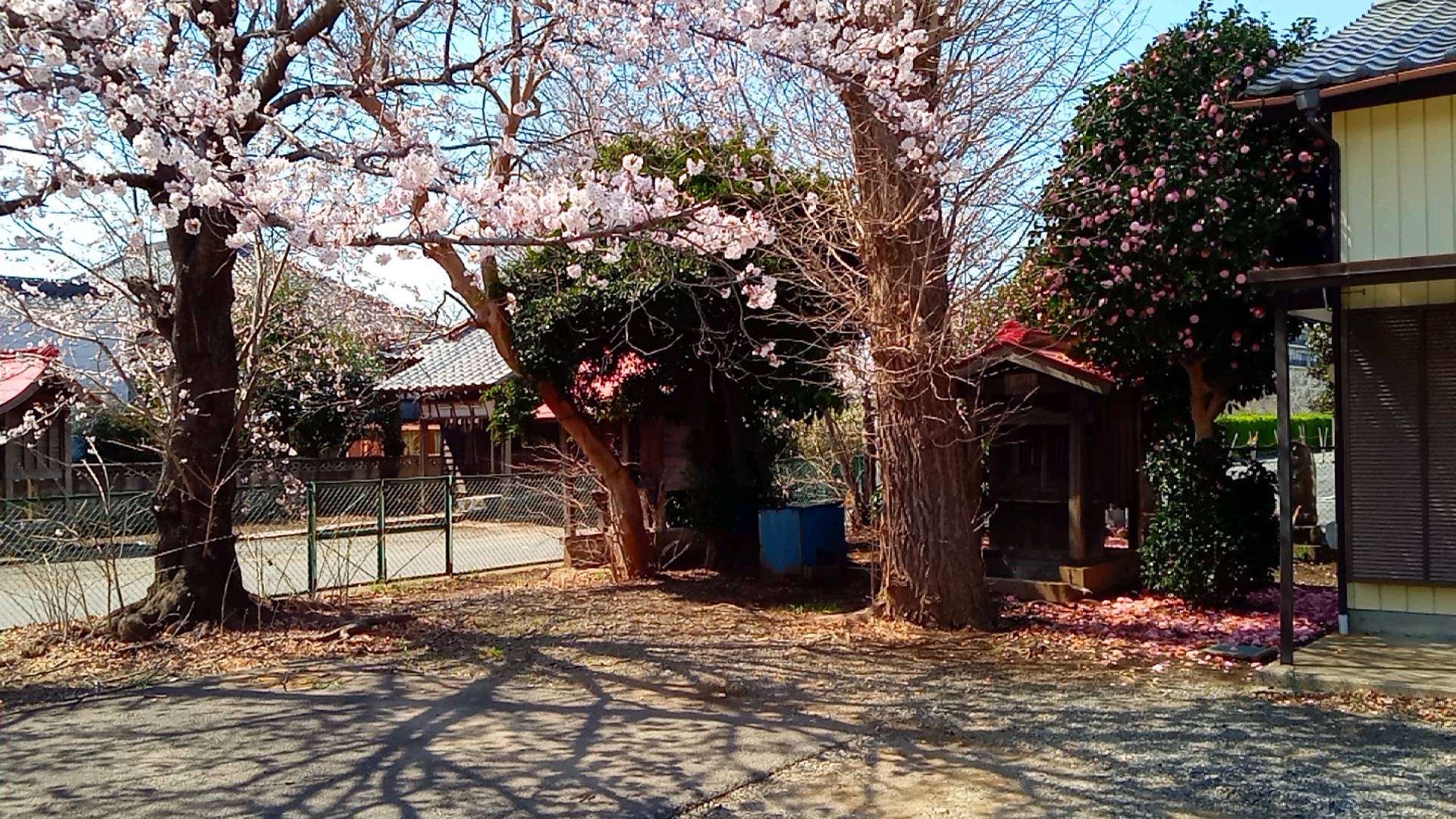 稲荷神社にお参りした後、駐車場と拝殿の間にある神宮寺札所にお参りする。ここには、札所のお堂の隣に客神の神社が祀られている。桜の花が満開である。