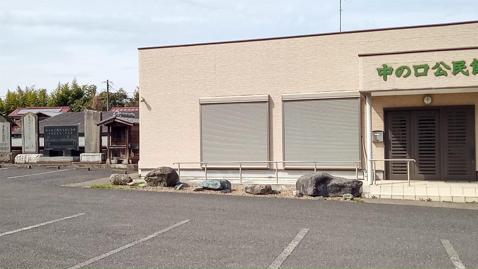 厳島神社から木下市街の中心部を移動する。左手には数メートル上の位置にスーパー堤防があり、そこに県道が通っている。堤防よりかなり低い位置に、公民館がある。