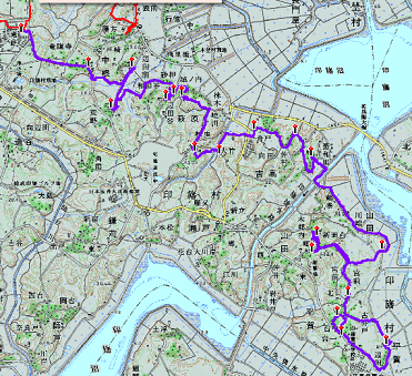 自宅 7:30 → (1.8km) 7:55 竜腹寺地蔵堂 8:00 → (1.2km) 8:25 東漸寺 8:30 → (1.2km) 8:50 荒野安楽院 8:55 → (2.0km) 9:30 五十七番慶昌寺 9:35 → (0.2km) 9:40 二番竜泉院 9:45 → (0.4km) 9:55 七十八番萩原観音堂 10:00 → (1.7km) 10:35 六十八番松虫寺 10:45→ (0.7km) 10:55 六十八番大竹 11:00 →(1.1km) 11:15 十九番西の堂 11:20 → (1.3km) 11:40 五十二番岡の堂 11:45 → (1.3km) 12:15 五十三番迎福寺(昼食休憩) 12:30 → (3.1km) 13:20 旧三十八番平賀離れ島 13:25 → (1.9km) 13:55 四十九番円天寺 14:00 → (0.8km) 14:20 七十三番円蔵寺 14:30 →(3.5km) 15:20 六十六番来福寺 15:30 →(2.2km) 16:00 六十九番平賀観音院 16:10 → (0.6km) 16:15 平賀支所前バス停 [GPS測定距離 25.0km]