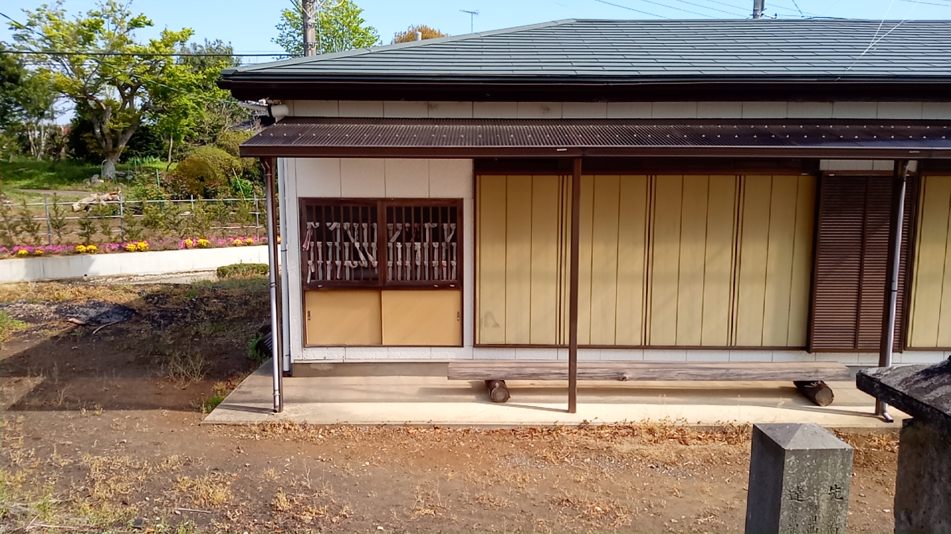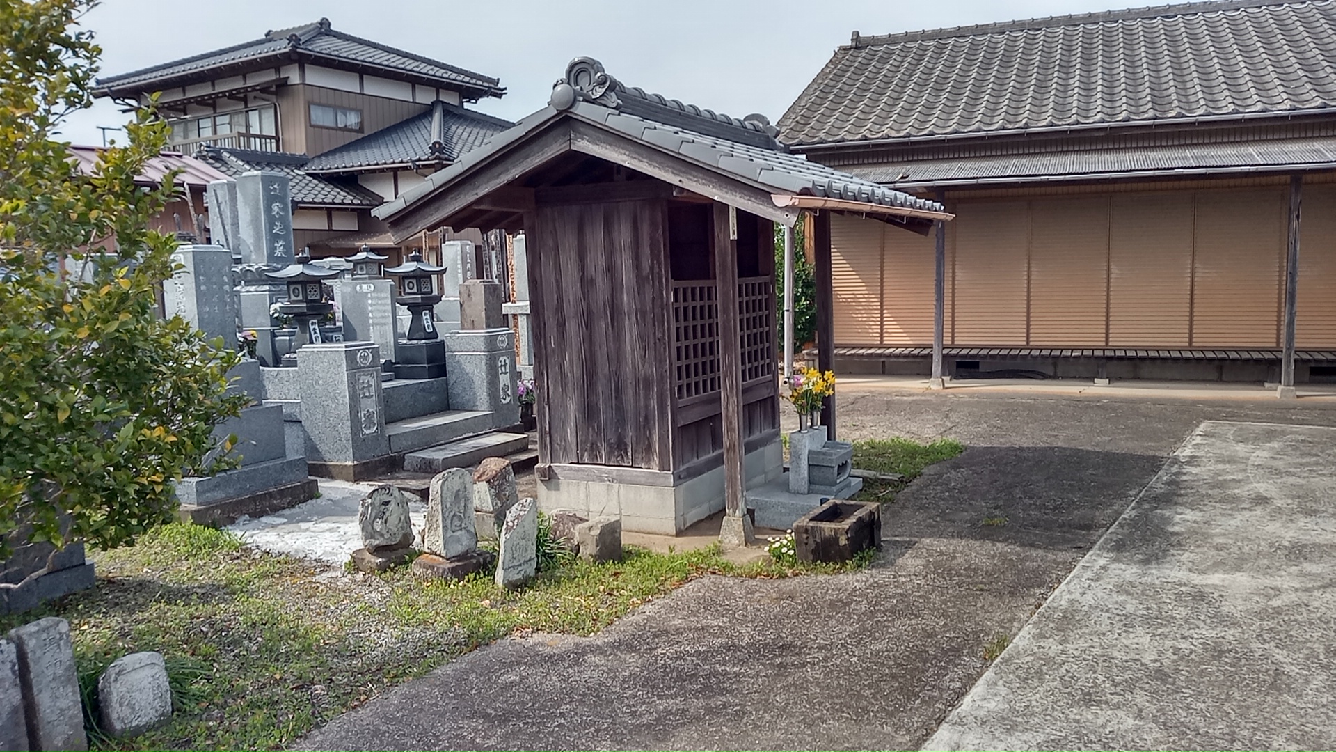 敷地は集会所と共同霊園となっており、札所は横長の小堂で2体のお大師様がいらっしゃる。定期巡行の時期だからだろう、小さな花束が供えられている。