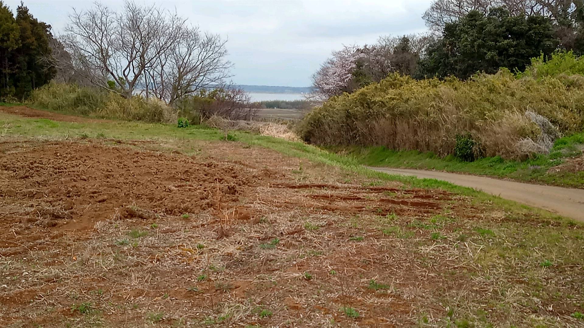 そして、急坂を登ってきただけあって、岡の堂の前から印旛沼を望むことができる。たいへんのびやかな景色である。ただし、順路は印旛沼に向かって伸びる道ではなく、さらに細い畑の中の道を進む。心細い山道は、宗像神社に向かっている。