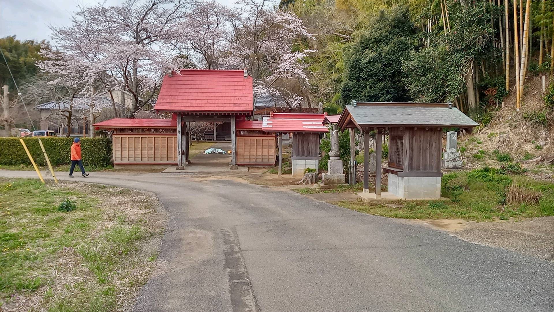 順天堂大学さくらキャンパスがすぐそばになると、来福寺の案内看板が出てくる。ここも桜が満開で、小さなお堂もたくさん置かれている。