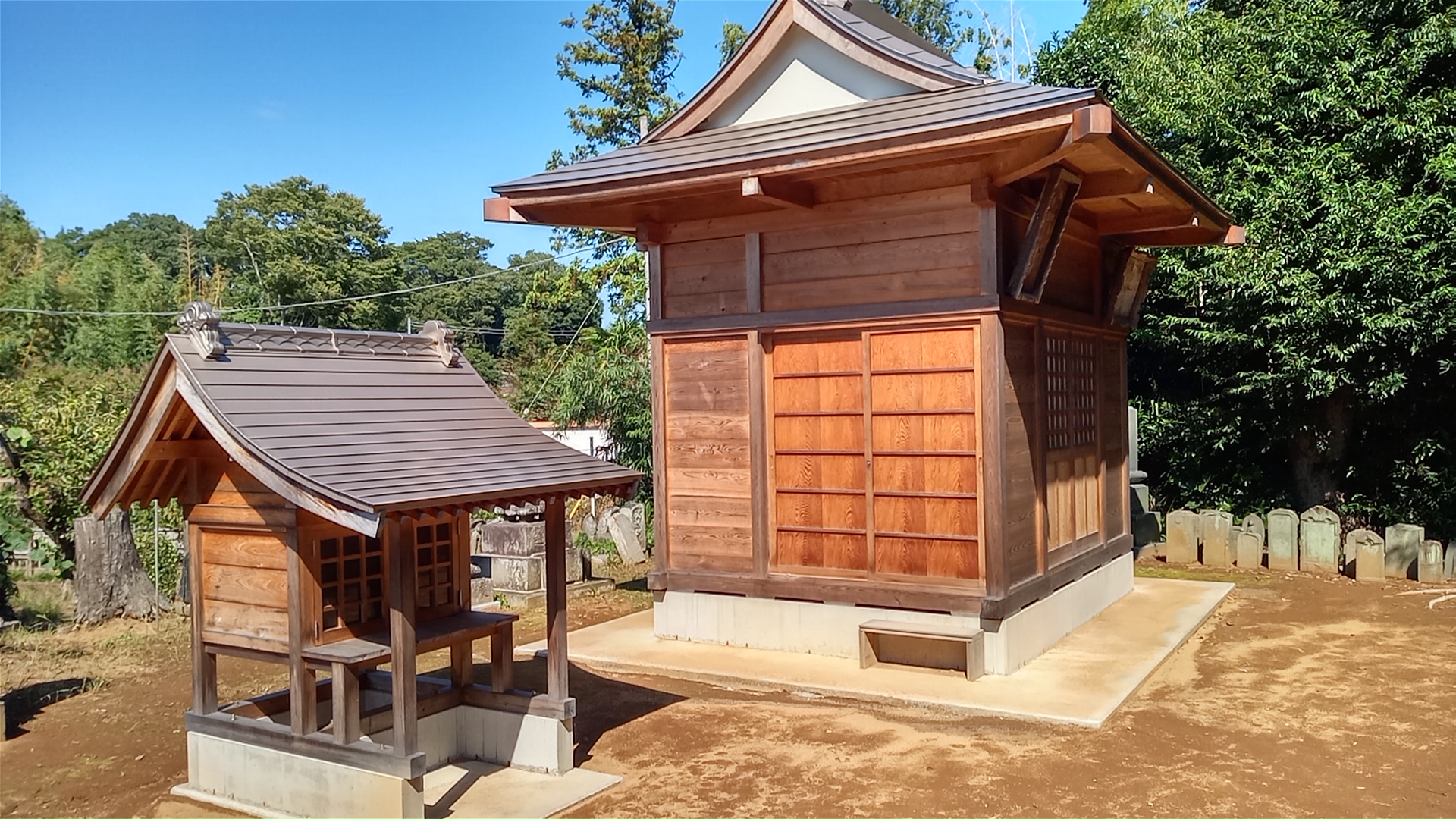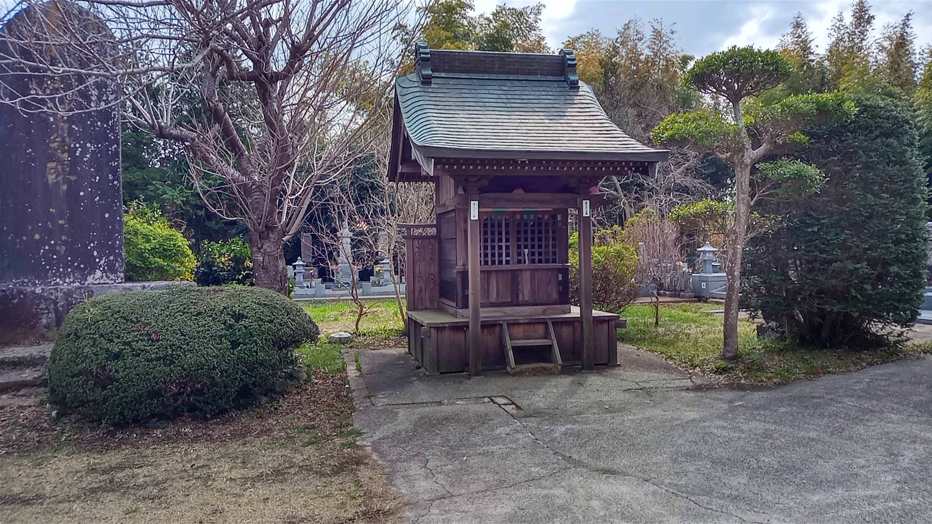 師戸集落の岡台地区にある由緒ありそうなお堂。建物自体は最近のものだが、周囲には古い石碑や墓碑がかなりの数残されている。
