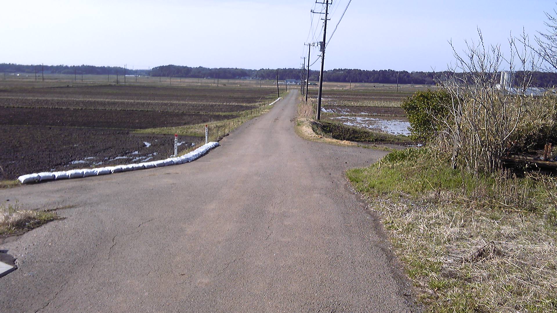 仲井堂を過ぎると農家はなくなり、森の中を続く道を登りやがて下って行く。下り切ったところはかつての印旛沼で、捷水路の開通によって水田となった場所である。対岸は佐倉市。遠くに見える林の向こうに、岩名運動公園や草笛の丘がある。