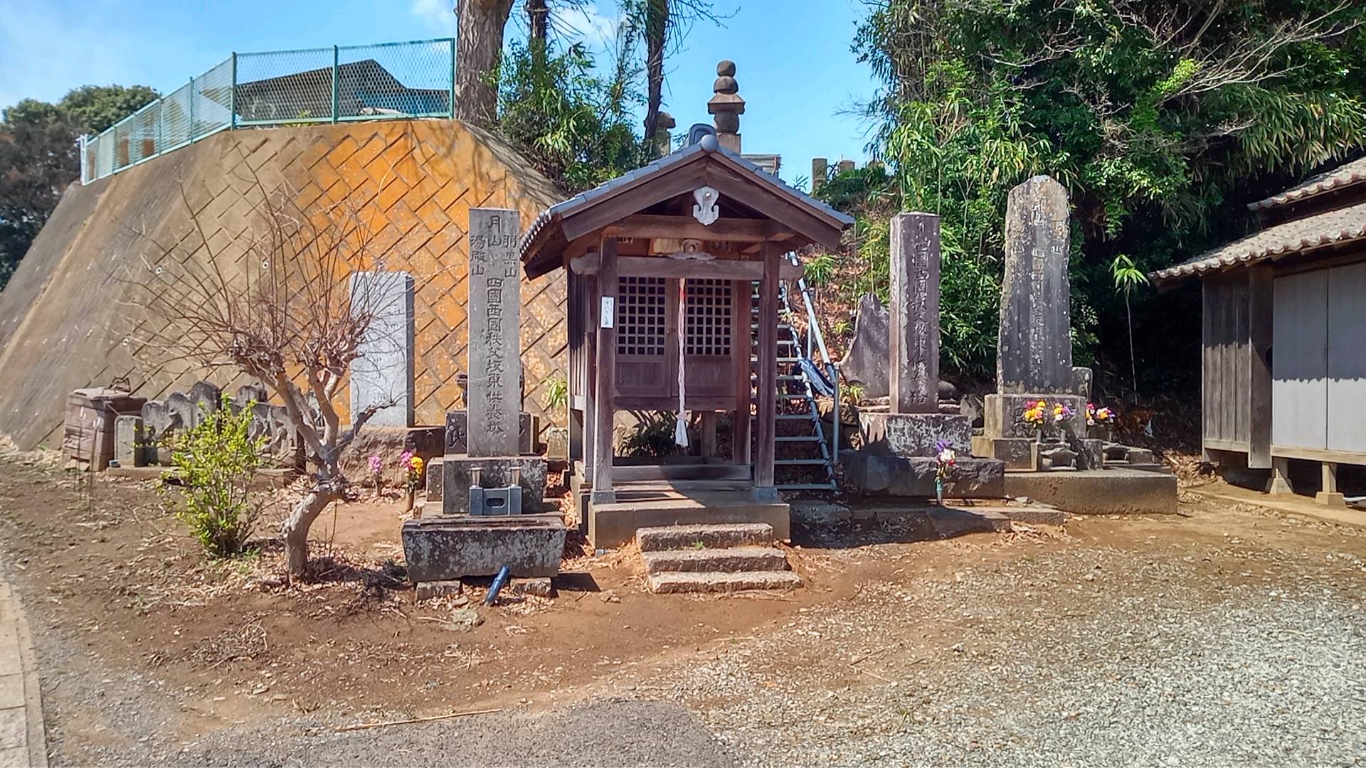 3つ並んだ小堂のいちばん右が印西大師の札所。長年の風雪で、格子が壊れかかっている。境内に石碑が多く残されているが、他の札所で見られた回向柱は見当たらなかった。