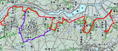 この図表はカシミール3Dにより作成しています。赤は4月に歩いたカンナ街道、紫は後日歩いた明治ルートと思われる経路。