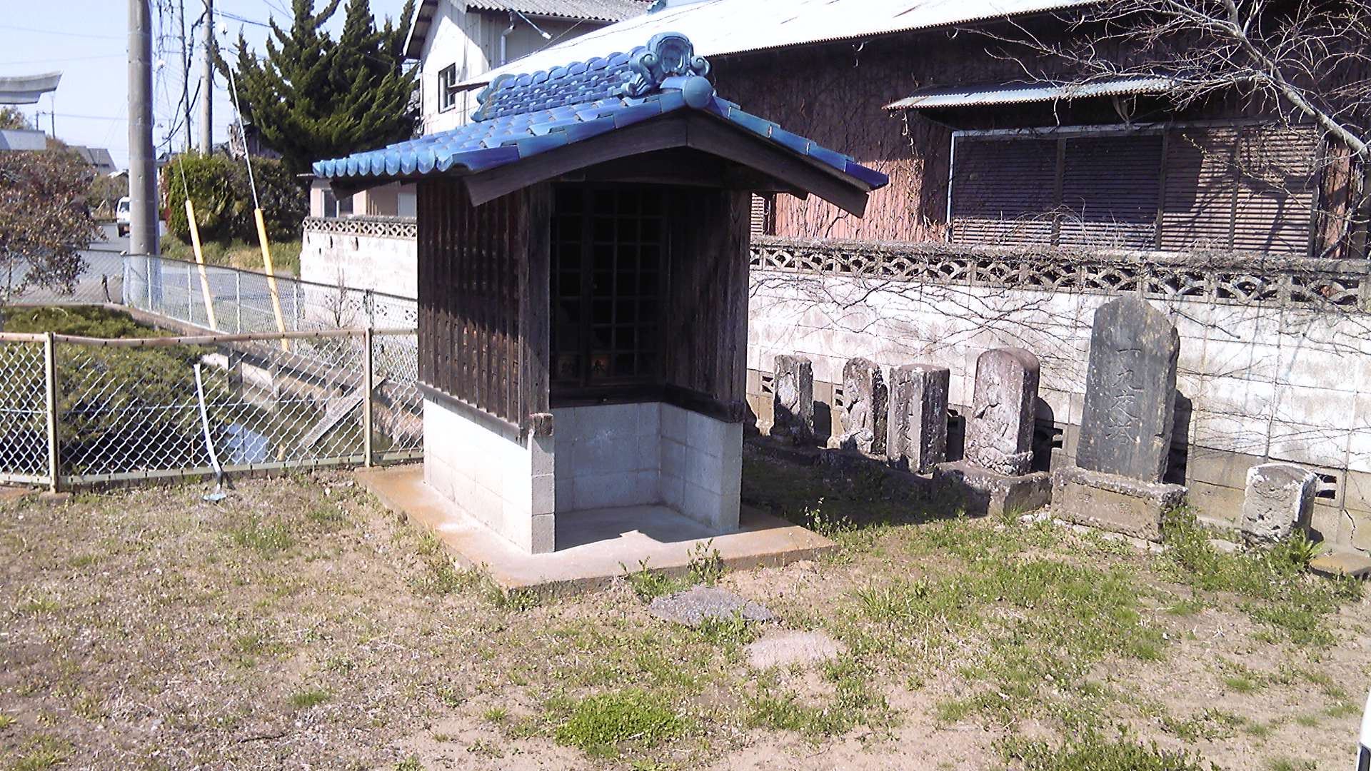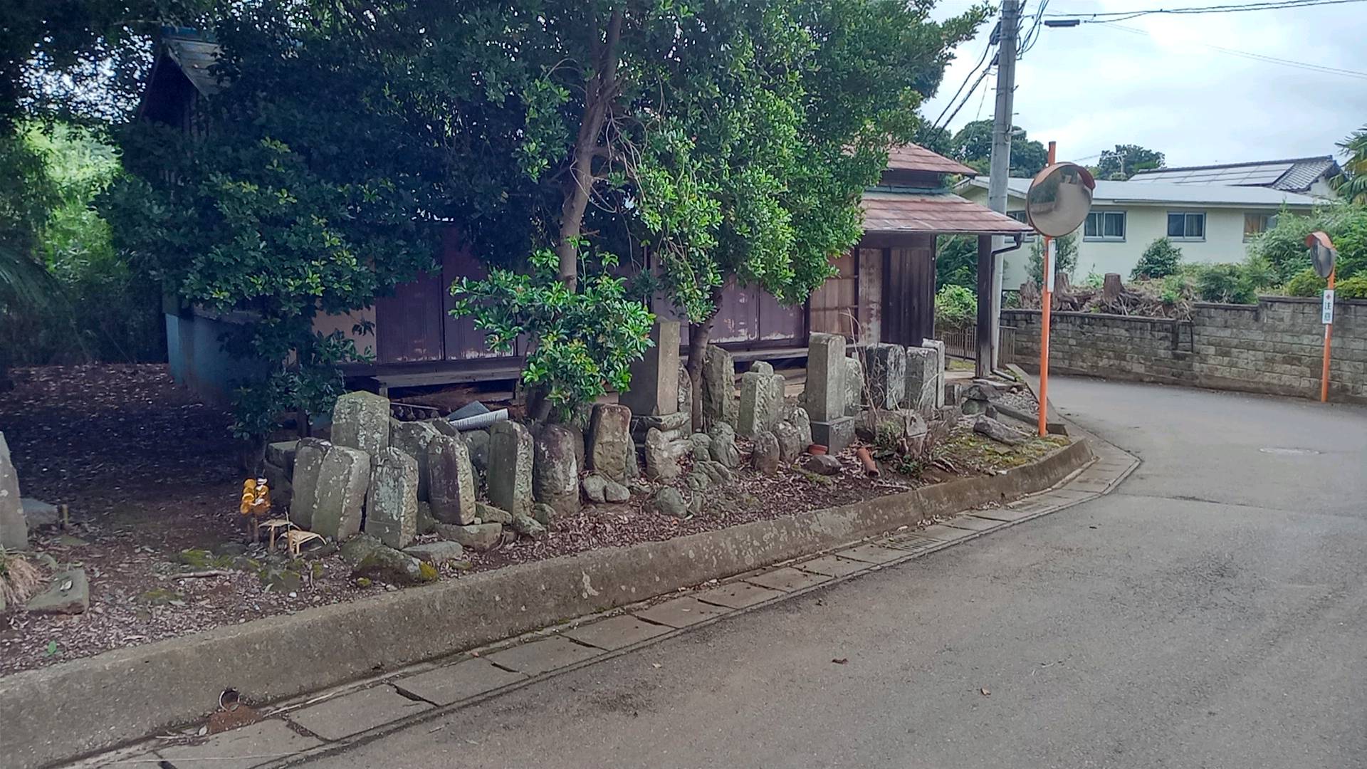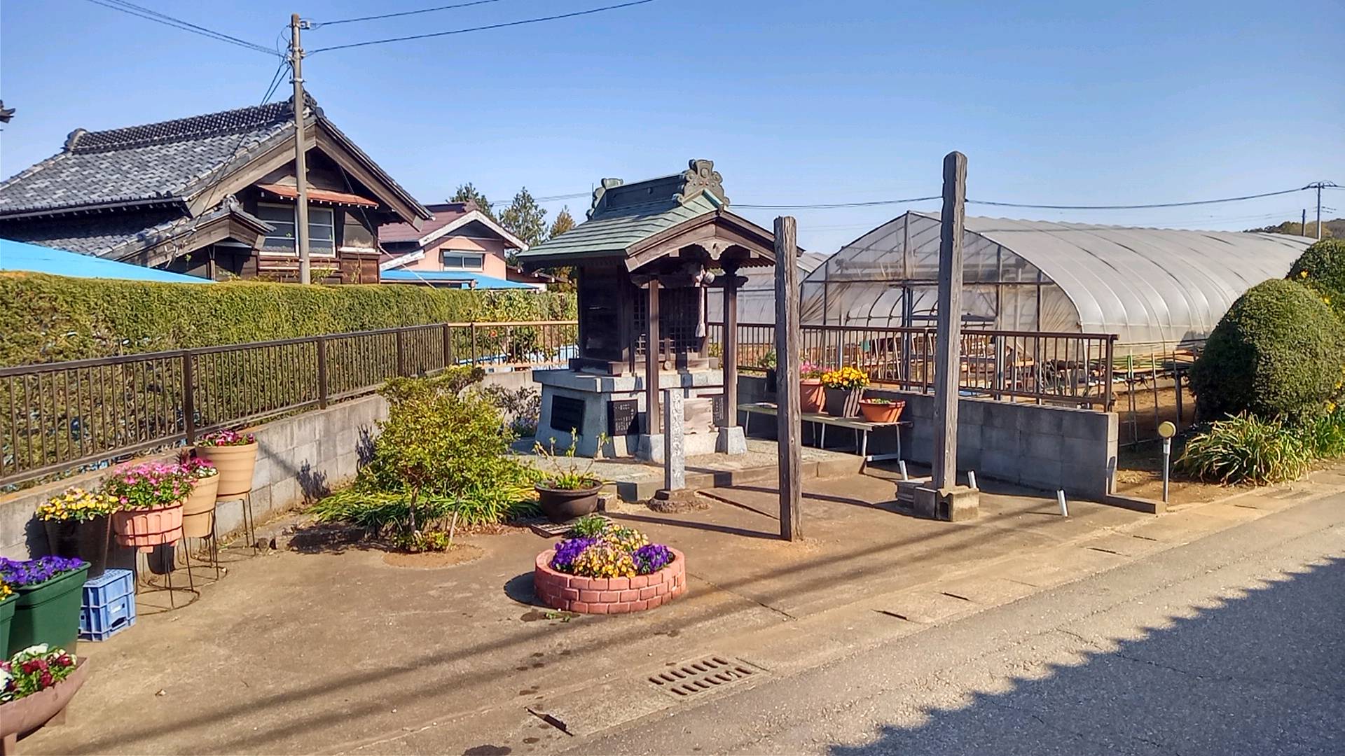 10分ほど歩くと、民家の間に小堂が現れた。お寺ではないものの、古い回向柱が2本立っている。ここだろうか。小堂はまさに札所のように古いものであるが、周囲に鉢植えの花が飾られているのが少し変わっている。Googleの場所とも少し違うようだ。