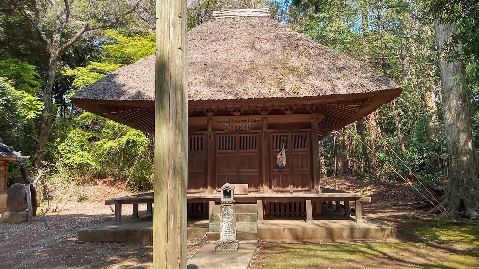 印西地区で最初に国の重文になった建物にもかかわらず、周囲は鬱蒼として暗い。貴重な古い萱葺き屋根も半分はブルーシートでおおわれている。正式には宝珠院観音堂で、かつては妙蔵寺という寺の別院であったことが解体修理の際分かっている。