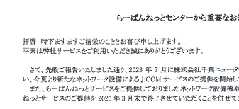というのは、ジェイコムになっても手続きがいらないというのは当面のことで、らーばんねっとのサービス自体が2025年3月で終了するという。それを先に言ってくれという話である。あと4ヶ月少々しかない。