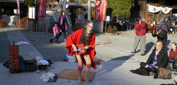 念仏の時点では観客は80人ほど。さきほどのカセットレコーダーの操作で、ボリュームがいつもより大きくなってしまっていて、大音声での念仏が、成田山川越別院の慶大に響きわたる。ただ、三味線の音量はそれほどでもないから、数珠を振り回す頃にはほとんど気にならなくなった。今回は体調がとてもよかったのだろう。動きにキレがありかつダイナミックである。