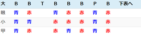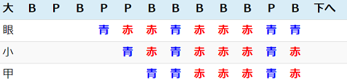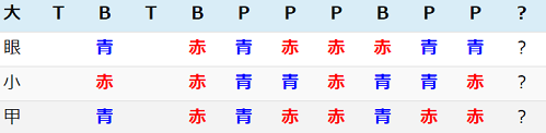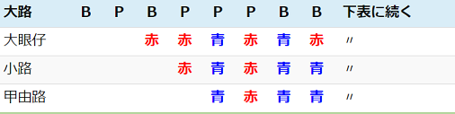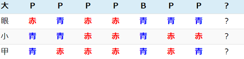この時思ったのは、大路では3目以上下りていないし、小路の赤青青は3回続いているということだった。だとすれば、ここは小路の青、つまりBに一人だけ賭けることになったのだが、いまこうしてみると大眼仔の青は直前の赤より必ず少ないし、甲由路の青赤赤だって2回続いている。大眼仔の赤、甲由路の青つまりPだって、十分ありえるパターンだったのだ。結果は確かリャンピンサンピンの望みのない手で、最初の勝負手を外した。