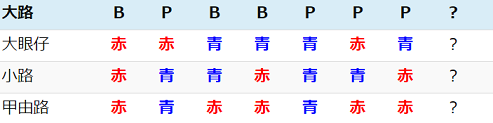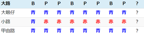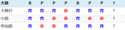 とらえどころのない罫線である。Bの5目ツラが出て、Pが弱いかとみるとBの3目にツラ返しである。ただし、中国罫線をみるとどの罫線をみても長いツラ目がない。つまり「パターンのないパターン」である。ここはどちらかというとPに人気は集まったが、Bに賭けた。大眼仔、小路、甲由路いずれをみても、青が来るとパターンであるのがお分かりいただけると思う。結果はBが5で勝った。