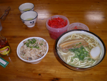 沖縄に着いてから空港でそーきそばを食べていたので、今回の遠征では2度目の沖縄そばだったのだけれど、だしの味は空港が濃いかつおだしで本土観光客向けのスープだったのに対し、こちらは昔ながらの沖縄の味に近いようである。もっとも、以前市場の奥で食べた「市内でいちばん安い沖縄そば」のいかにも豚っぽいスープほどではない。