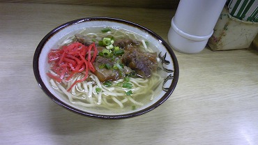 「ガレッジセール」(当然、沖縄出身である)がどこかの番組で紹介したらしく、店の前にそんなことが書いてある。ただ、この日は公設市場の休業日のせいか、結構すいていて先客は一組だけ。カウンターに腰掛けてソーキそばを注文する。なんと350円。那覇では最も安いと書いてある。確かに、空港の半分以下の値段である。