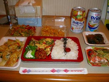 特に、海ぶどうやジーマミー豆腐、ジューシー(沖縄風まぜごはん)、野菜の炊き合わせ、天ぷら盛り合わせなどがすごく安いので(150~300円くらい)、これを買って帰って夕ごはんにすることにした。泡盛の蔵元を回ったときにもらったミニボトルもあるし、初日に仕入れたオリオンビールもまだ残っている。おいしそうだし、わざわざ外に食べに行くより安上がりである。