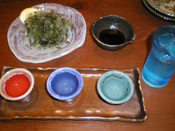 古酒3種飲み比べセットと、おつまみは海ぶどう。