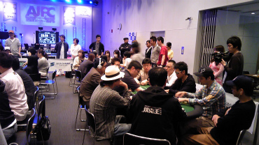 そしてシニアトーナメントは約1時間遅れの2時に、6テーブルまででスタート。7番テーブルはメインの飛び待ち、さらにレイト・レジストレーションの人が待つという状況で開始となった。後で確かめたら74人参加ということだったので、2テーブルとか3テーブルしかなかったAJPC初期と比べたら、大変なにぎわいである。