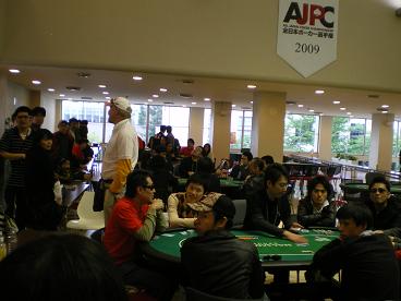 大阪予選最後の組、予選Cで指定されたテーブルは2番テーブルの5番。キャンセル待ちで出られない方がいたくらいだから、満席の50人。勝ち抜けは6人。スタートは2時半となる。予選Bでは、第一回AJPCチャンピオンの全裸の会会長が大暴れしているようだ。