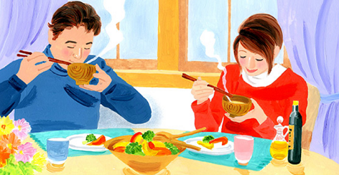 サントリーウェルネスのDMイラストの食事風景、なにげに糖質制限食になってます。コロナ仕様隣り合わせだし。