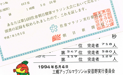 ランニングに関して手許に残っているのは、マラソン大会に出たときの記録証だけである。当時、各地で地域振興のためのマラソン大会が盛んに開催されていて、「ランナーズ」という雑誌にその情報が詳しく載っていた。