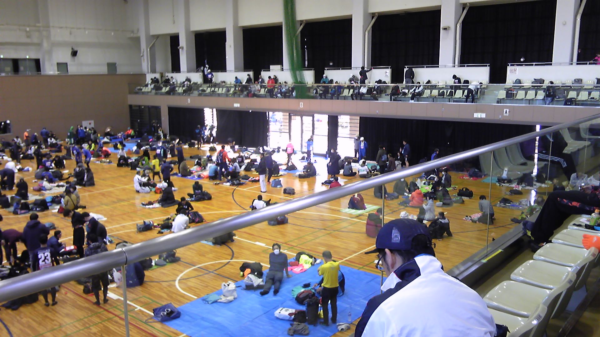予想通り、体育館の中では参加者がそれぞれレジャーシートを広げて荷物を置いている。私もレジャーシートを用意していたが、まだ2階の椅子席が空いている。椅子の方が座りやすいので2階まで上がる。